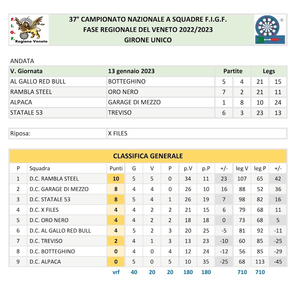 Continua la serie di vittorie per il dart club Rambla Steel che, nella quinta giornata di campionato, piega gli ostici avversari del dart club “Oro Nero” con il punteggio di 7 a 2.